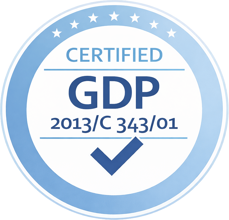 DIN ISO 9001:2015 Qualitätsmanagement. Zertifiziert gem. GDP EU-Richtlinien 2013/C68/01 & 2015/C95/01 – vollständig auditiert.